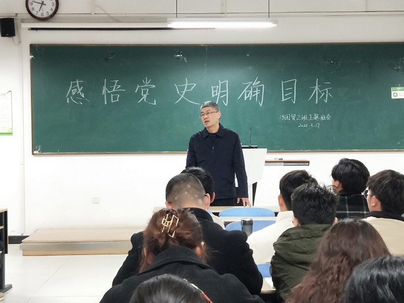 陽春三月,時光荏苒,美好而充滿希望的大學生活轉眼間來到第三個年頭。為進一步貫徹落實學校領導聯系學生制度,切實深入學生之中,真正做到了解學生所想、滿足學生所需、指引學生所向。校黨委副書記阮愛民于3月17日晚上走進18級國貿2班班會課堂,在中國共產黨百年華誕之際與學生一起感悟黨史,分享學習心得與目標。
