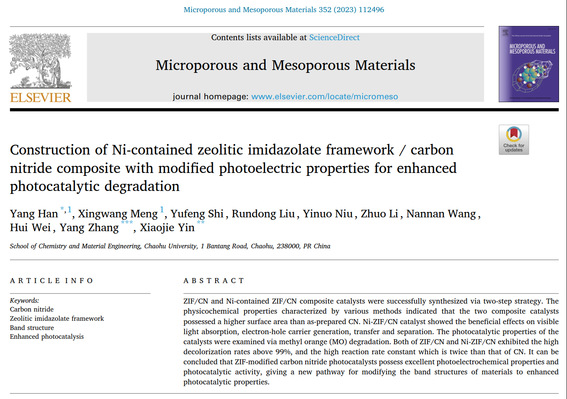 近日,化材學院高性能復合材料創新科研團隊韓陽博士在光催化復合材料研究中取得進展,相關成果以“Construction of Ni-contained zeolitic imidazolate framework / carbon nitride composite with modified photoelectric properties for enhanced photocatalytic degradation”為題發表在國際權威期刊《Microporous and Mesoporous Materials》(中科院二區,IF:5.876)。