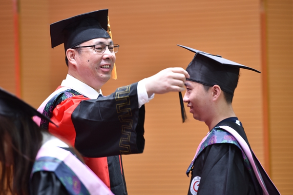 伴隨著莊嚴的《加冕進行曲》,校領導、各學院院長依次為畢業生代表頒發學位證書、扶正流蘇。