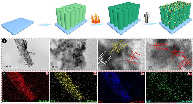論文采用水熱法在TiO2納米管上沉積Sn3O4–Ag–Ag2O納米顆粒。通過對(duì)樣品形貌、微觀結(jié)構(gòu)和光催化性能的研究,發(fā)現(xiàn):Ag+濃度為0.8 mmolAgNO3制備的Ag-0.8樣品具有優(yōu)異的光催化降解染料性能,可見光催化制H2速率高達(dá)每小時(shí)55.79μmol?cm-2。論文獲巢湖學(xué)院博士啟動(dòng)基金(KYQD2023002)、安徽教育廳高校科研基金重點(diǎn)項(xiàng)目(2022AH051725,2022AH051721)、安徽省高校科研團(tuán)隊(duì)(kj22kctd02)和巢湖學(xué)院校企共建中心項(xiàng)目(kj22xqyx01)資助。