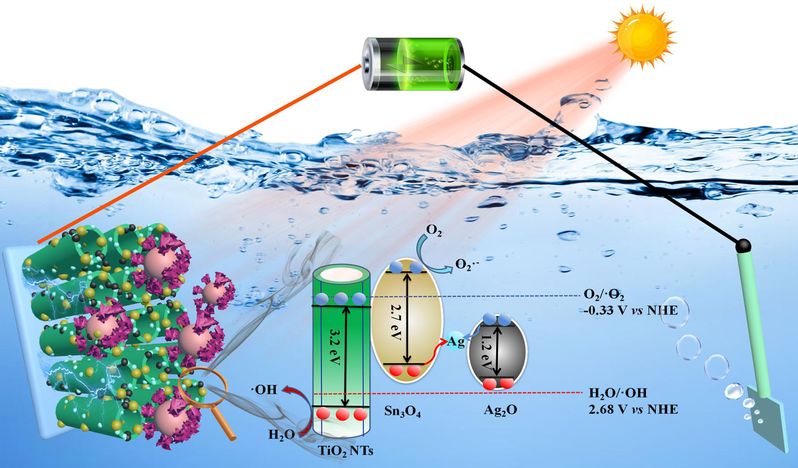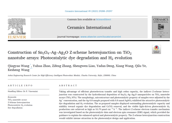 近日,巢湖學(xué)院機(jī)械工程學(xué)院王青堯科研團(tuán)隊(duì)在國(guó)際材料領(lǐng)域top期刊《Ceramics International》上發(fā)表了題為“Construction of Sn3O4–Ag–Ag2O Z-scheme heterojunction on TiO2nanotube arrays: Photocatalytic dye degradation andH2evolution”的研究論文。該刊物創(chuàng)刊于1981年,主要接收包括陶瓷、玻璃等無(wú)機(jī)非金屬材料以及其工藝相關(guān)主題的文章,為中科院大類一區(qū)期刊,影響因子為5.13,為世界權(quán)威材料科學(xué)刊物之一。