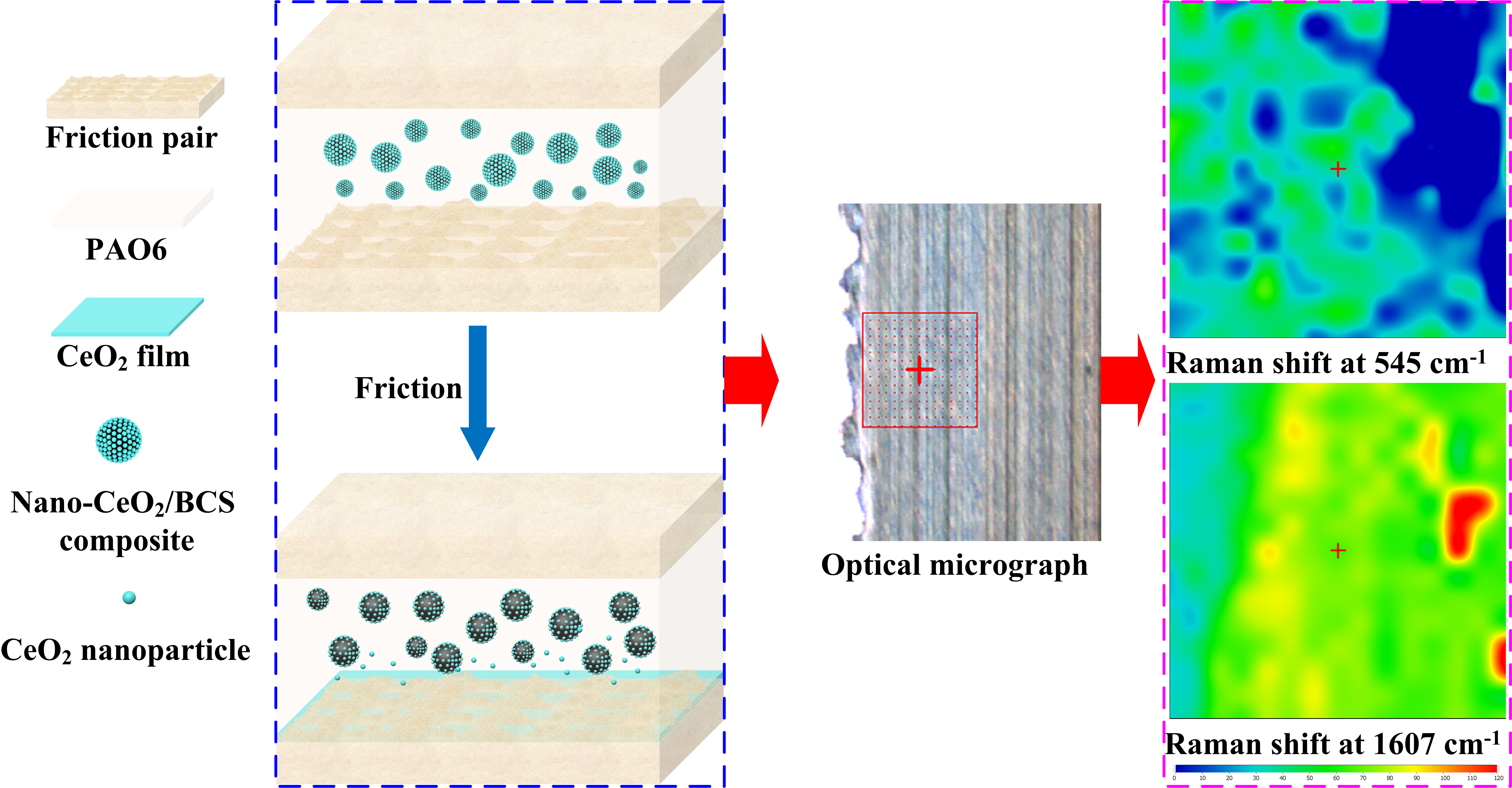 碳基固體潤滑材料一直是減摩抗磨新材料領域的研究重點之一,有著廣闊的應用價值和前景。李川博士制備的納米CeO2/BCS碳基復合材料作為潤滑材料,展現出極大的優勢:納米CeO2/BCS碳基復合材料的引入顯著地提升了PAO6基礎油的減摩抗磨性能。這主要歸因于潤滑顆粒在摩擦界面上的“微滾珠”效應并在摩擦界面上摩擦沉積形成復合潤滑膜,以及CeO2納米粒子和BCS納米粒子之間的協同增強效應。本研究所制備的碳基復合材料具有優異的潤滑性能并將在工業工程實際中獲得應用。
