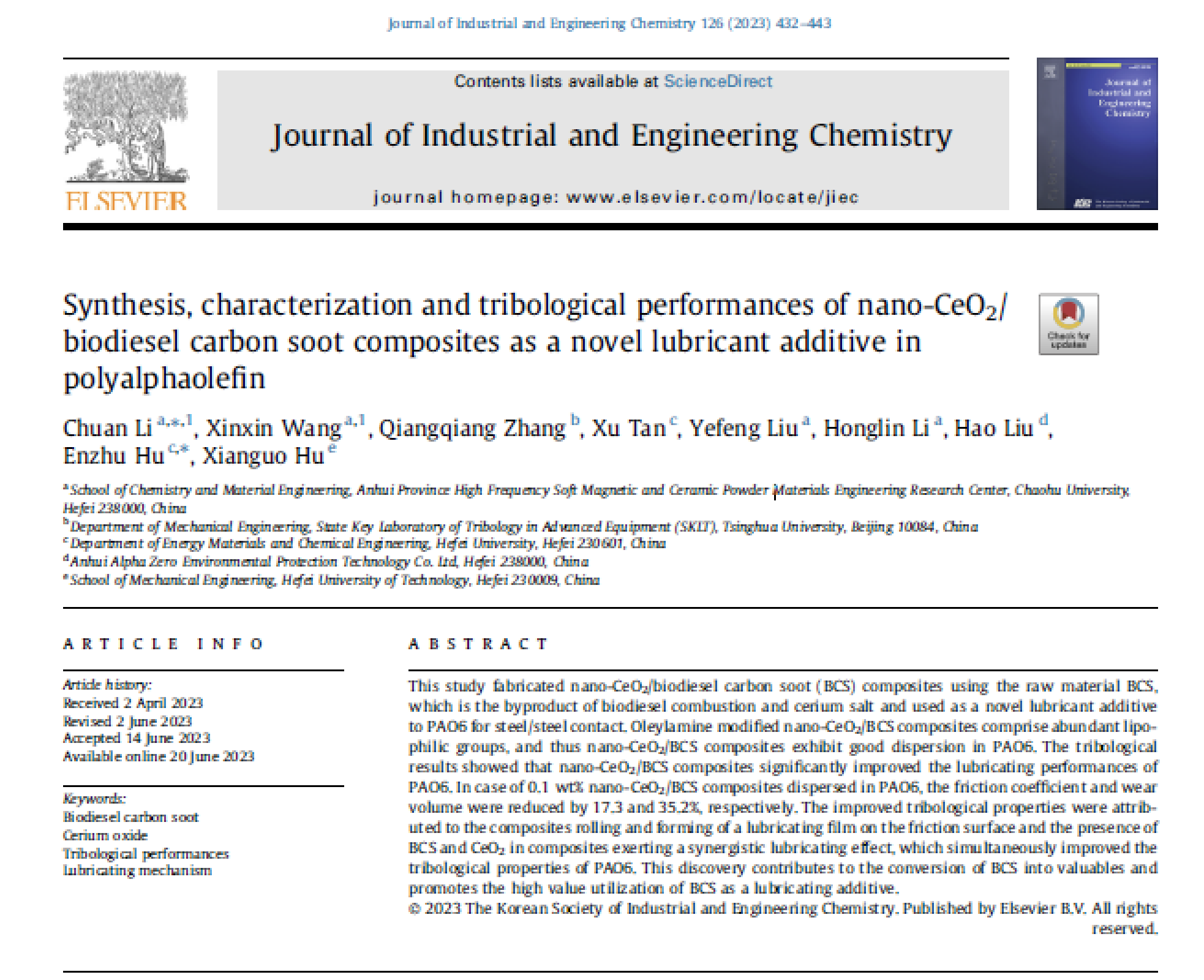 近日,化材學院綠色能源與潤滑材料科研團隊李川博士在高性能納米潤滑材料研究中取得進展,相關成果以“Synthesis,characterization and tribological performances of nano-CeO2/biodiesel carbon soot composites as a novel lubricant additive inpolyalphaolefin”為題發表在國際權威期刊《Journal of Industrial and EngineeringChemistry》(中科院2區,IF:6.760)。