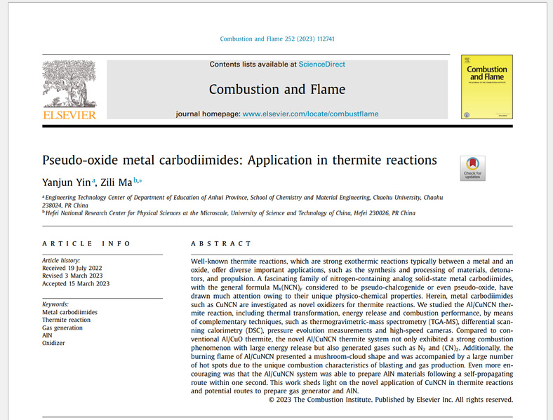 近日,化學與材料工程學院無機功能材料科技創新團隊尹艷君博士在含能材料研究中取得重要進展,相關成果發表在國際燃燒領域Top期刊《Combustion andFlame》(中科院2區)。