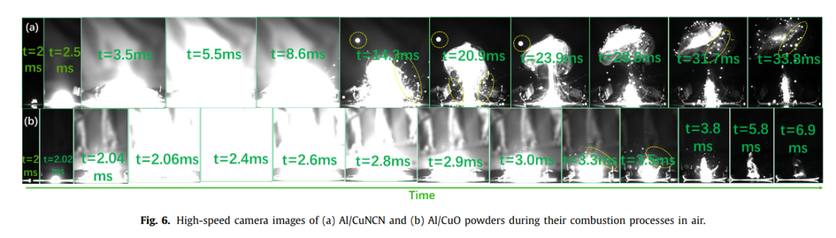 以銅基過渡金屬氰胺化合物CuNCN為例開展了新型鋁熱反應機制的研究。采用溶液法成功制備了Cu(NCN)化合物,并與納米Al物理混合組裝了Al/Cu(NCN)鋁熱劑。與常規的Al/CuO鋁熱劑相比,新型Al/CuNCN鋁熱劑體系不僅表現出強烈的燃燒現象,能量釋放巨大,而且會產生N2和(CN)2等氣體。此外,Al/CuNCN的燃燒火焰預先發出蘑菇云形狀,并伴有大量熱點,這是由于爆破和氣體產生的獨特燃燒特性。更令人鼓舞的是,Al/CuNCN系統能夠在瞬間自蔓延燃燒制備AlN材料。這項工作闡明了CuNCN在鋁熱反應中的新應用,以及制備氣體發生器和AlN的潛在途徑。