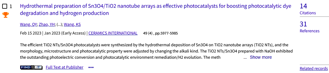 據(jù)科睿唯安ESI最新數(shù)據(jù),機(jī)械工程學(xué)院王青堯博士2023年2月發(fā)表在中科院一區(qū)TOP期刊《Ceramics International》的研究論文Hydrothermal preparation of Sn3O4/TiO2nanotube arrays as effective photocatalysts for boosting photocatalytic dye degradation and hydrogenproduction于2023年9月被ESI數(shù)據(jù)庫遴選為高被引論文。