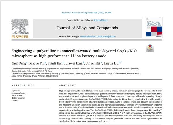 近日,化材學院柔性儲能材料和器件科研團隊彭貞老師在鋰離子電池負極材料的研究中取得新進展,相關研究成果以“Engineering a polyaniline nanoneedles-coated multi-layered Co3O4/NiO microsphere as high-performance Li-ion battery anode” 為題發表在國際權威期刊《Journal of Alloys andCompounds》(中科院2區,影響因子6.2)