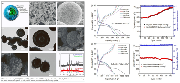 本工作通過簡單的水熱反應設計合成多層中空核殼結構Co3O4/NiO微米球,同時在微米球表面原位生長導電聚合物聚苯胺(PANI)納米針,柔性聚苯胺包裹層提高了活性材料的導電性,同時有效防止了金屬氧化物核殼結構在循環過程中因為體積膨脹引起的結構坍塌,增強其穩定性,提高了活性材料的循環性能。用Co3O4/NiO@PANI復合材料制作鋰離子電池負極材料,在100次循環后依然保持1049mAhg?1的充電容量。該工作為設計制備高性能的鋰離子電池負極材料提供了借鑒,具有一定的應用價值。