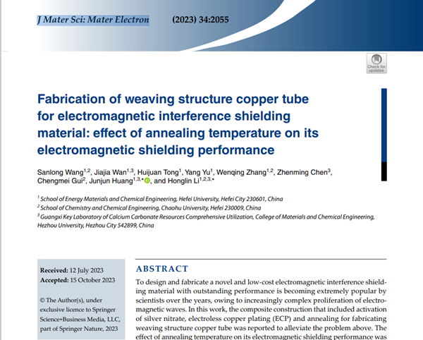 近日,我院李宏林教授指導2021級碩士研究生王三龍和張文慶在性能優異的新型低成本電磁干擾屏蔽材料研究中取得新進展,相關成果以“Fabrication of weaving structure copper tube for electromagnetic interference shielding material: effect of annealing temperature on its electromagnetic shielding performance”為題發表在國際權威期刊《J Mater Sci: Mater Electron》(SCI收錄,IF:2.779),以“Fabrication of Textile-based Triboelectric Nanogenerator toward high-efficiency energy harvesting and material recognition”為題發表在國際權威期刊《Mater Horiz》(SCI收錄,IF:13.3),以“Fabrication of triboelectric nanogenerators with multiple strain mechanisms for high-accuracy material and gesture recognition”為題發表在國際權威期刊《J. Mater. Chem.A》(SCI收錄,IF:11.9)。