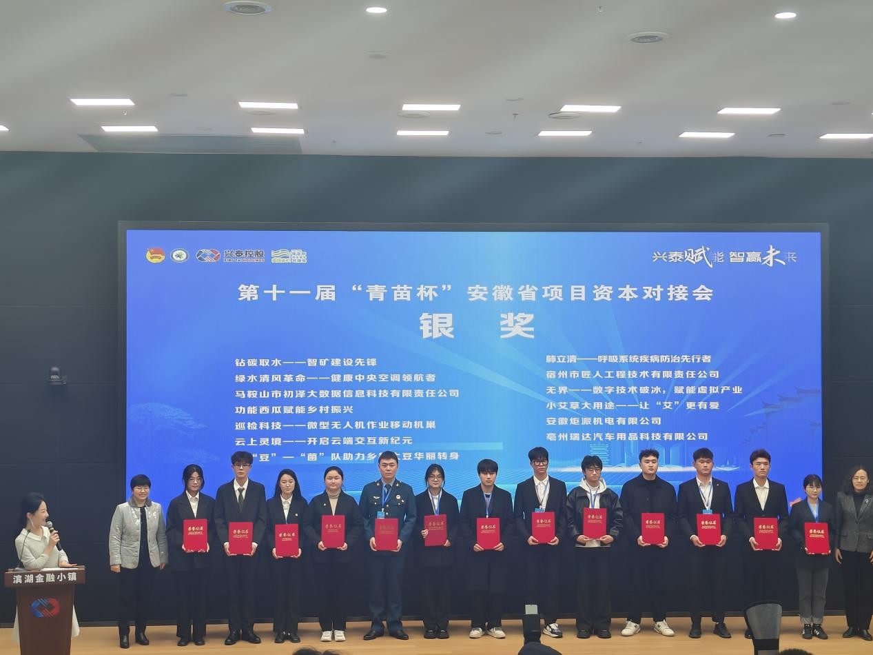 2024年3月7—8日,第十一屆“青苗杯”安徽省項目資本對接會在合肥舉辦。巢湖學院《巡檢科技——微型無人機作業移動機巢》創業項目成功入圍終審路演,并獲得銀獎,學校榮獲“優秀組織獎”。