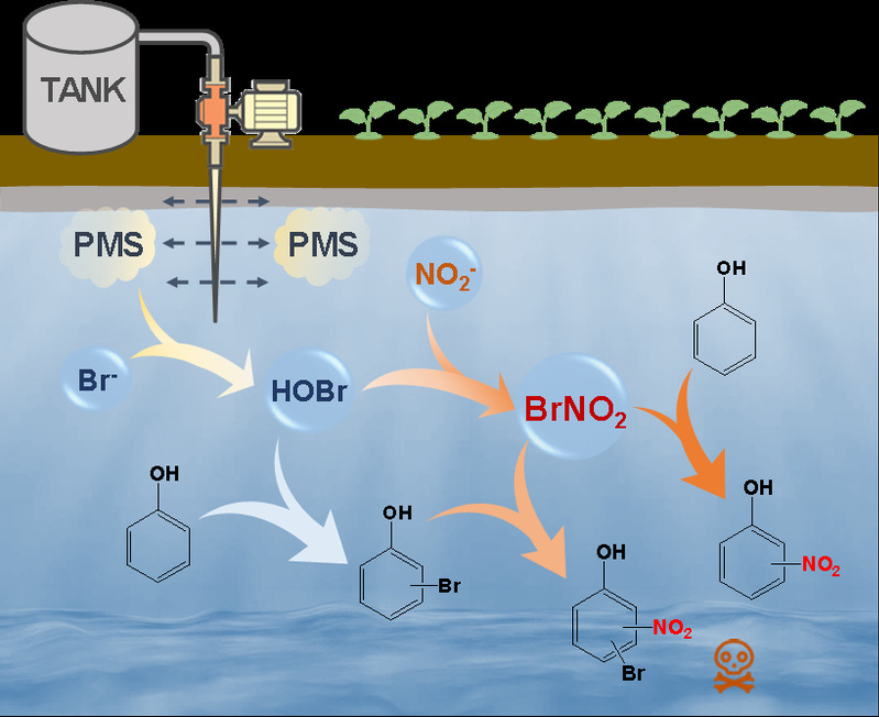 基于硫酸根自由基(SO4?-)的高級氧化工藝(SR-AOPs)在土壤及地下水污染的原位修復領域具有廣闊應用前景。SO4?-可以由加熱、紫外輻射、過渡金屬離子或堿活化過一硫酸鹽(PMS)或過二硫酸鹽(PDS)產生,該自由基具有氧化電位高(2.5-3.1 V)、選擇性好、壽命長和化學穩定性強等特點。以往的研究發現,環境中普遍存在的溴離子(Br-)和亞硝酸鹽(NO2-)均能夠被SO4?-氧化,生成一系列溴代副產物和硝基副產物。然而,目前對于未活化的PMS氧化過程中溴代和硝基副產物共生成情況鮮有研究。