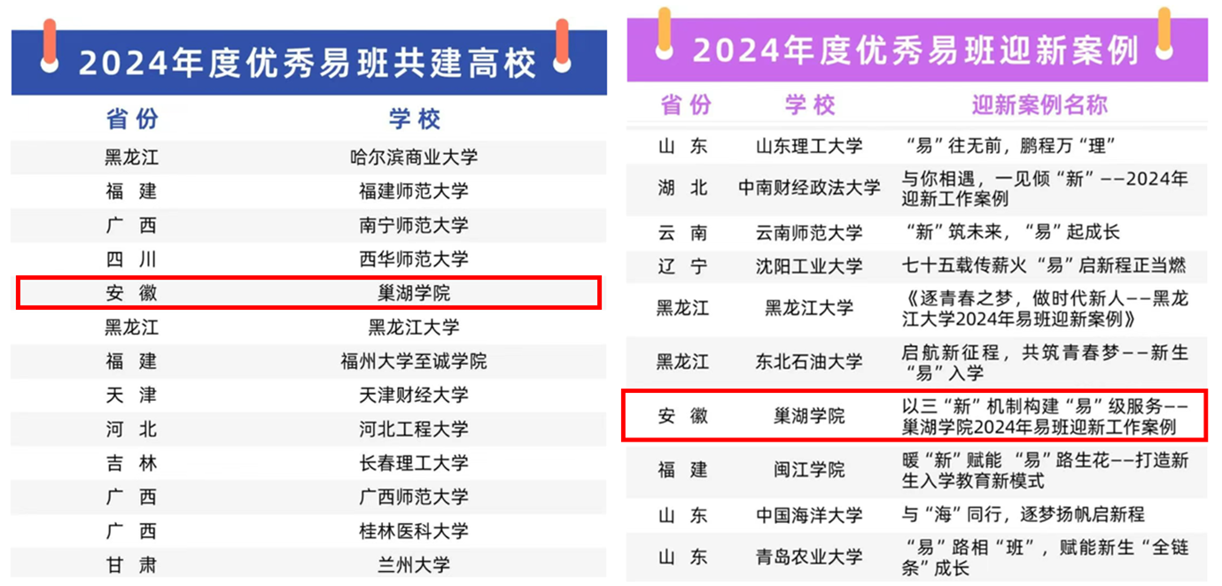 近日,教育部易班發(fā)展中心公布了2024年度全國易班共建高校優(yōu)秀工作案例遴選結(jié)果。我校獲評2024年度“優(yōu)秀易班共建高校”,《以三“新”機(jī)制構(gòu)建“易”級服務(wù)——巢湖學(xué)院2024年易班迎新工作案例》獲評2024年度“優(yōu)秀易班迎新案例”。