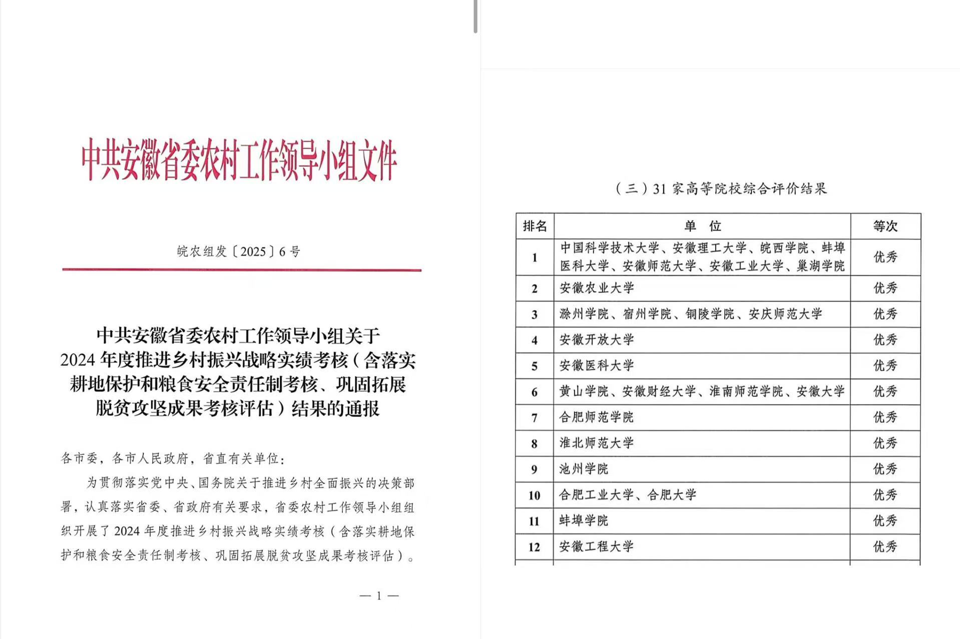 近日,安徽省2024年度推進(jìn)鄉(xiāng)村振興戰(zhàn)略實(shí)績(jī)考核(含落實(shí)耕地保護(hù)和糧食安全責(zé)任制考核、鞏固拓展脫貧攻堅(jiān)成果考核評(píng)估)結(jié)果公布,巢湖學(xué)院獲得安徽省2024年度推進(jìn)鄉(xiāng)村振興戰(zhàn)略實(shí)績(jī)考核(鞏固拓展脫貧攻堅(jiān)成果考核評(píng)估)優(yōu)秀等次,與中國(guó)科學(xué)技術(shù)大學(xué)、安徽理工大學(xué)、皖西學(xué)院、蚌埠醫(yī)科大學(xué)、安徽師范大學(xué)、安徽工業(yè)大學(xué)等6所高校并列第一。