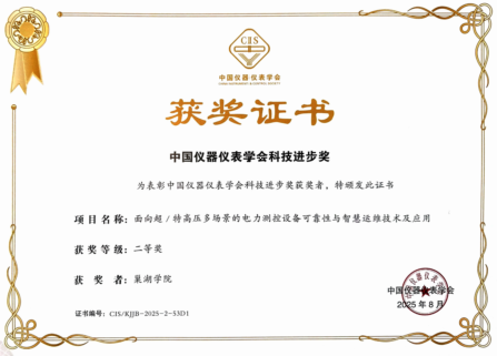 2025年8月14日,2025年度中國(guó)儀器儀表學(xué)會(huì)科學(xué)技術(shù)獎(jiǎng)?lì)C獎(jiǎng)儀式在長(zhǎng)沙舉行,我校作為第一完成單位與國(guó)網(wǎng)安徽省電力有限公司、上海大學(xué)、工業(yè)和信息化部電子第五研究所等單位聯(lián)合開(kāi)展科技攻關(guān)的項(xiàng)目成果《面向超/特高壓多場(chǎng)景的電力測(cè)控設(shè)備可靠性與智慧運(yùn)維技術(shù)及應(yīng)用》獲評(píng)科技進(jìn)步獎(jiǎng)二等獎(jiǎng)。其中,電子工程學(xué)院方愿捷副教授為項(xiàng)目負(fù)責(zé)人,王靜副教授、阮義博士、叢昊博士、程傳良博士等為主要參與人。