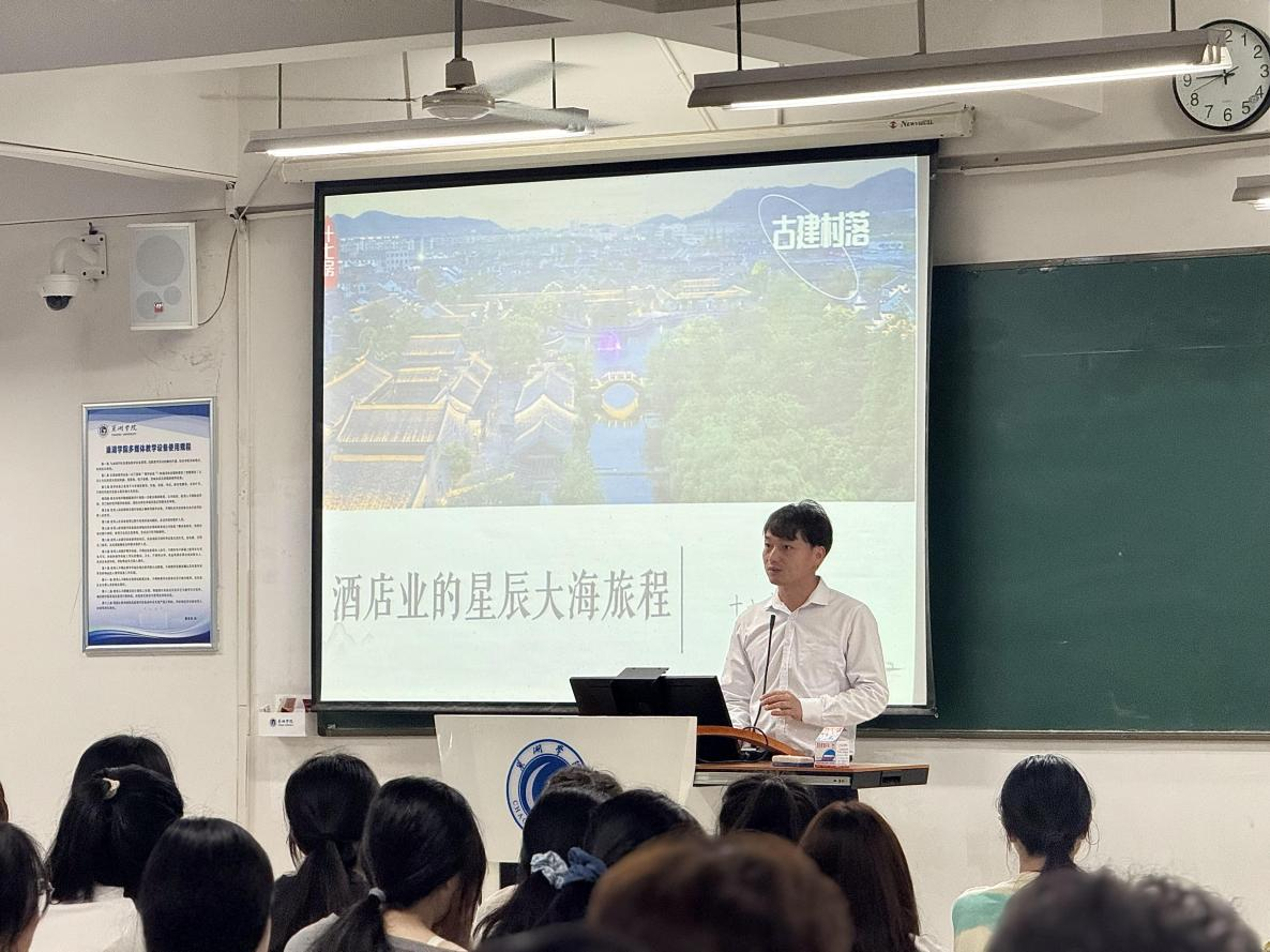 9月9日,旅游管理學院2025級新生專業導論課第二課在慎思樓中201教室舉辦。本節課程特邀學院重要戰略合作伙伴——開元旅業集團旗下寧波十七房開元觀堂總經理、我院2018屆優秀畢業生陳夫猛擔任主講。專業導論課由學院副院長朱學同主持。