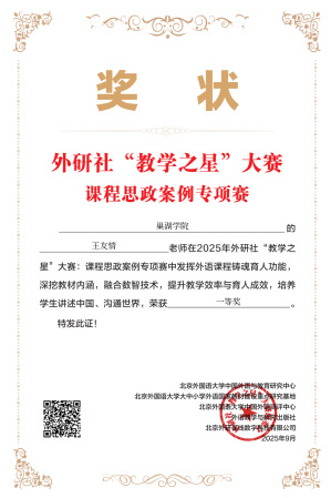 近日,2025年外研社“教學之星”大賽課程思政案例專項賽評選結果揭曉,巢湖學院外國語學院教師憑借卓越教學設計與創新思政教育理念,在激烈競爭中脫穎而出,斬獲佳績。王友情獲全國一等獎,王鋼、王娟(小)、郭佳鑫分獲全國三等獎。