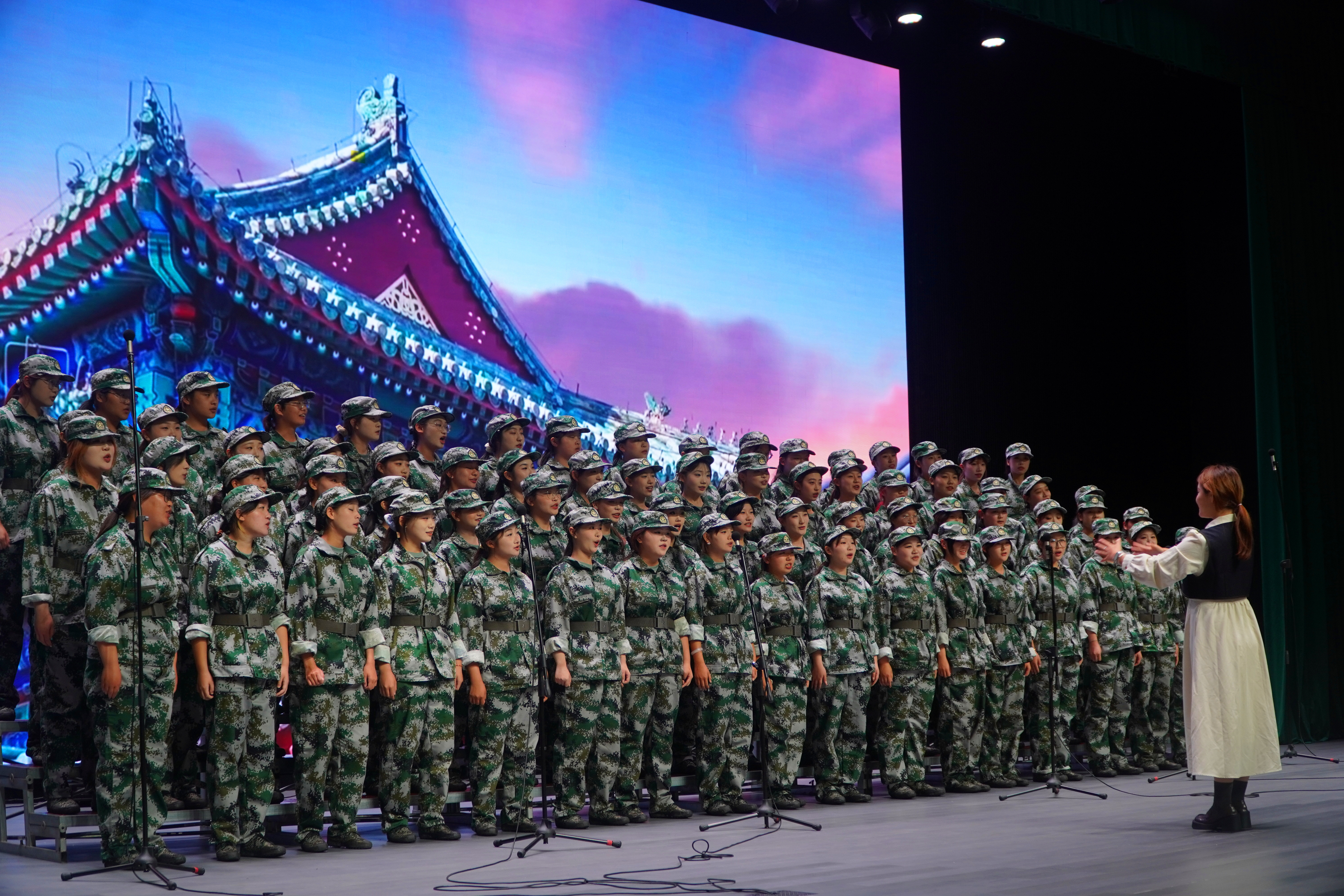 比賽現場,10支連隊依次登臺亮相,用真摯歌聲編織起一張跨越時空的紅色記憶網,每一曲都承載著青年學子的赤子之心。《我和我的祖國》《我的祖國》《國家》分別以個人情感與家國大義的視角,抒發“家國同心”的情懷,婉轉的歌聲中滿是對祖國的深情依戀;《長城謠》深沉悠揚的曲調緩緩喚醒民族抗爭的集體記憶,字里行間皆是對祖國山河的赤誠守護與對民族精神的深切傳承;《歌唱祖國》鼓手與合唱的精妙呼應讓旋律愈發昂揚振奮,磅礴氣勢感染著在場每一位觀眾;《強軍戰歌》節奏鏗鏘、斗志昂揚,歌聲中飽含新時代青年對國防力量的崇高敬仰,更傳遞出投身報國、守護家國的堅定決心;《保衛黃河》則以排山倒海之勢震撼全場,激昂旋律生動再現抗日烽火中的民族豪情,將比賽氛圍推向最高潮。