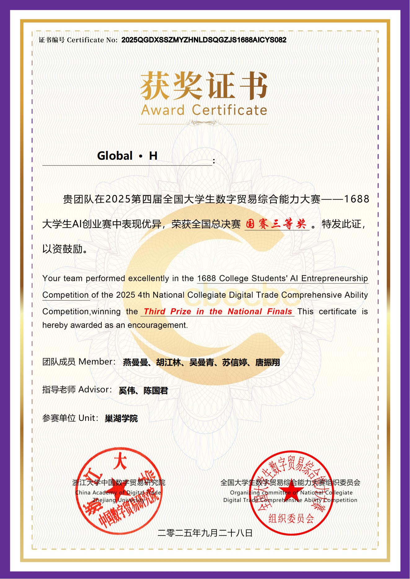 9月26日下午,參賽團(tuán)隊(duì)在指導(dǎo)教師的帶領(lǐng)下,展開了緊張有序的全過程排練,從路演展示到臨場答辯,不放過任何一個(gè)細(xì)節(jié)。27日上午,來自全國各地的100余支隊(duì)伍陸續(xù)走進(jìn)答辯現(xiàn)場,第四屆全國大學(xué)生數(shù)字貿(mào)易綜合能力大賽——1688大學(xué)生AI創(chuàng)業(yè)賽正式拉開帷幕。面對由5名評委組成的評審團(tuán),GlobalHorizon按照多日來的演練,有條不紊地完成了項(xiàng)目匯報(bào)。匯報(bào)結(jié)束后,評委們首先對團(tuán)隊(duì)成果給予肯定,隨后圍繞“貨物投放平臺、貨物供應(yīng)保障、客戶問題及時(shí)響應(yīng)”等關(guān)鍵環(huán)節(jié)進(jìn)行提問,團(tuán)隊(duì)成員均給予準(zhǔn)確且專業(yè)的答復(fù)。經(jīng)過不懈努力,不畏強(qiáng)手,一路過關(guān)斬將,GlobalHorizon團(tuán)隊(duì)最終獲得國賽三等獎(jiǎng)的好成績。