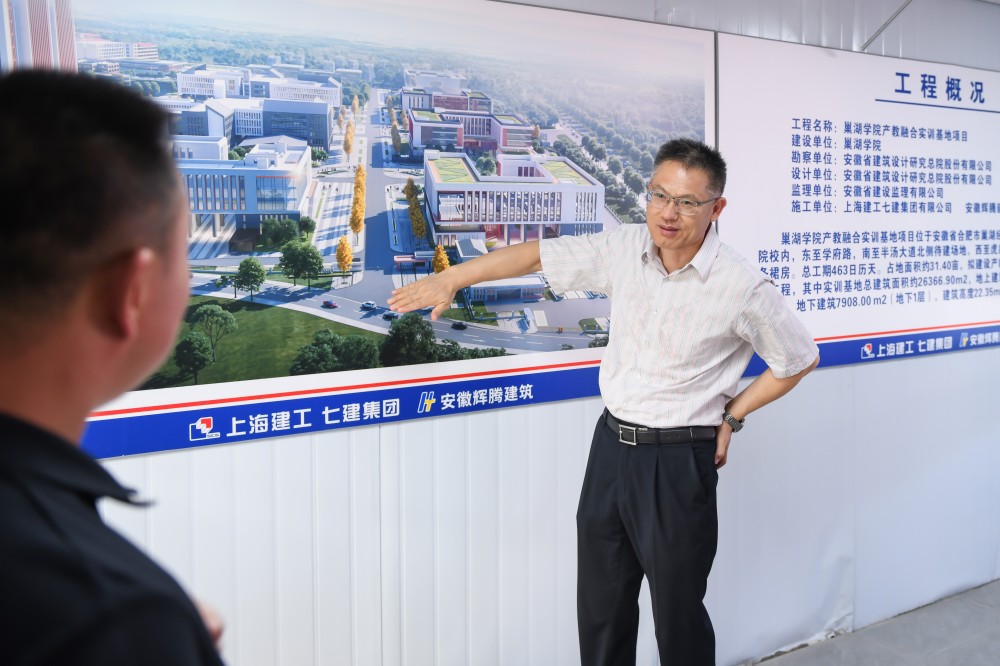 10月9日下午,校黨委書記周峰,黨委副書記、校長張莉,黨委副書記宋立敏,黨委委員、副校長周祥,黨委委員、紀委書記、監察專員錢銳,集體到產教融合實訓基地項目工地,檢查指導工程建設工作。