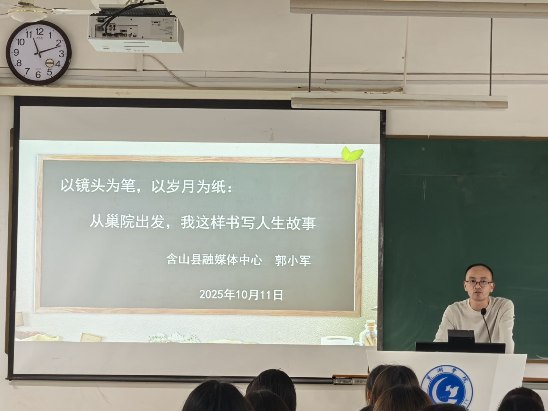 為助力學生拓寬就業與創業視野、進一步強化核心競爭力,10月12日上午,文學與傳媒學院在慎思樓北103教室舉辦校友論壇講座。此次講座特邀含山縣融媒體中心輿論監督部主任、學院漢語言文學教育專業2006屆校友郭小軍擔任報告人,以“以鏡頭為筆,以歲月為紙:從巢院出發,我這樣書寫人生故事”為主題。2024級、2025級網絡與新媒體專業學子參加活動,活動由學院副院長王宇明主持。