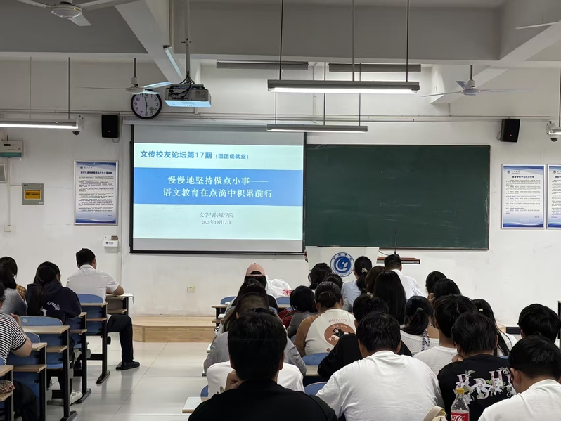 10月12日上午,文學(xué)與傳媒學(xué)院第17期校友論壇在慎思樓北102教室舉行。本次論壇特邀學(xué)院1998級漢語言文學(xué)專業(yè)優(yōu)秀校友、現(xiàn)任巢湖市第一中學(xué)教師張隋全擔(dān)任主講,為2024級、2025級漢語言文學(xué)專業(yè)學(xué)生作了題為“慢慢地堅(jiān)持做點(diǎn)小事”的專題講座。論壇由學(xué)院副院長陳先濤主持。
