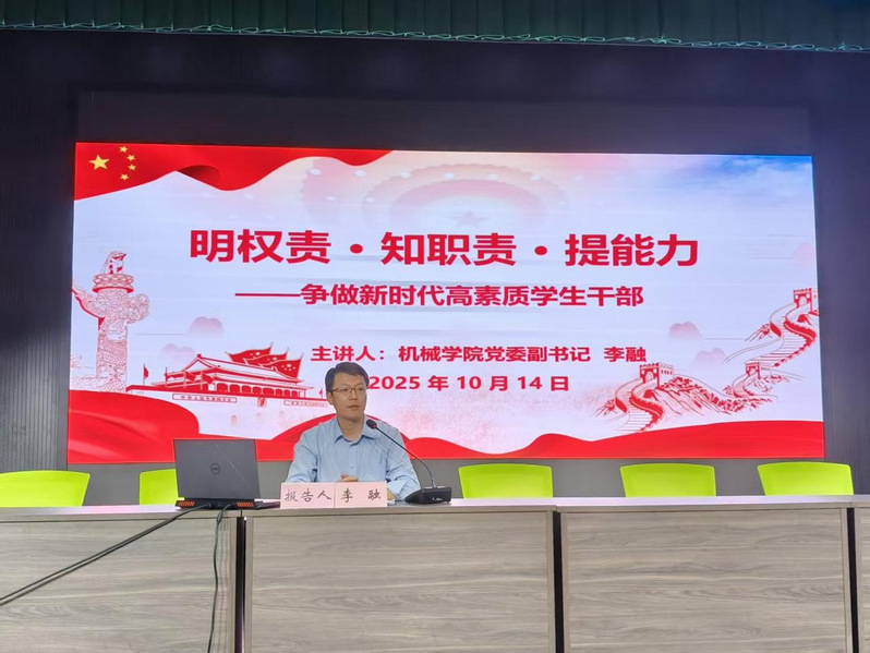 為進一步加強學生干部隊伍建設,提升學生干部素質能力,著力鍛造一支有崇高理想、實踐能力、強烈擔當精神的學生干部隊伍,10月14日晚,機械工程學院在大學生活動中心四樓會議室舉辦機械“菁英”學生干部素質能力提升工程培訓班開班儀式。學院黨委副書記、紀委書記李融出席會議。學院全體輔導員、團學組織全體學生干部、25級班級全體學生干部參會。會議由團委書記蘇潔紅主持。