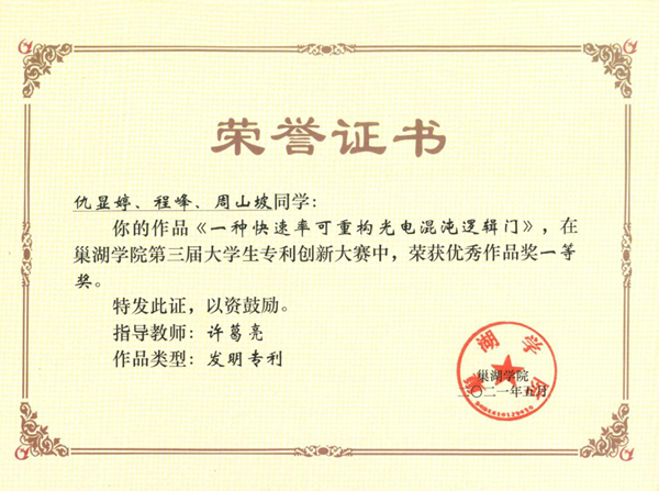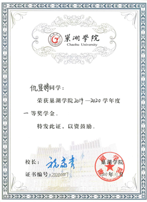 仇顯婷,女,漢族,1999年8月出生,安徽省阜陽市潁東區人,中共黨員,電子工程學院電子信息工程專業2018級學生。在校期間,曾獲國家獎學金、國家勵志獎學金、巢湖學院校級一等獎學金以及巢湖學院“優秀學生”、“三好學生”等榮譽稱號,曾在巢湖學院第三屆大學生專利創新大賽上獲一等獎。參與國家級大學生創新創業項目1項,期間與項目成員共同發表兩篇學術論文。在2022年研究生入學考試中,考入安徽大學電子信息(智能感知技術及應用方向)專業。