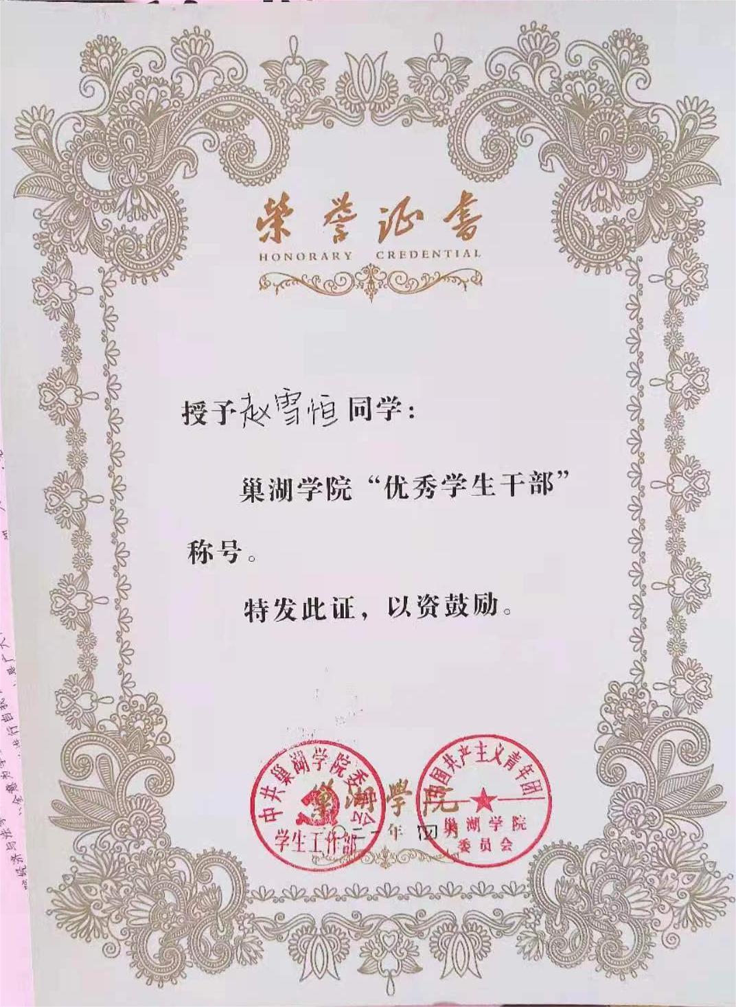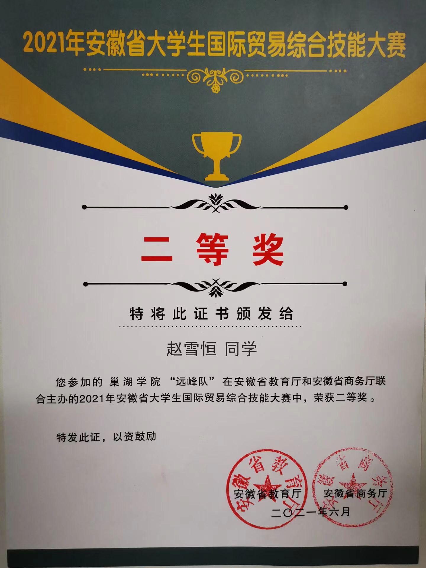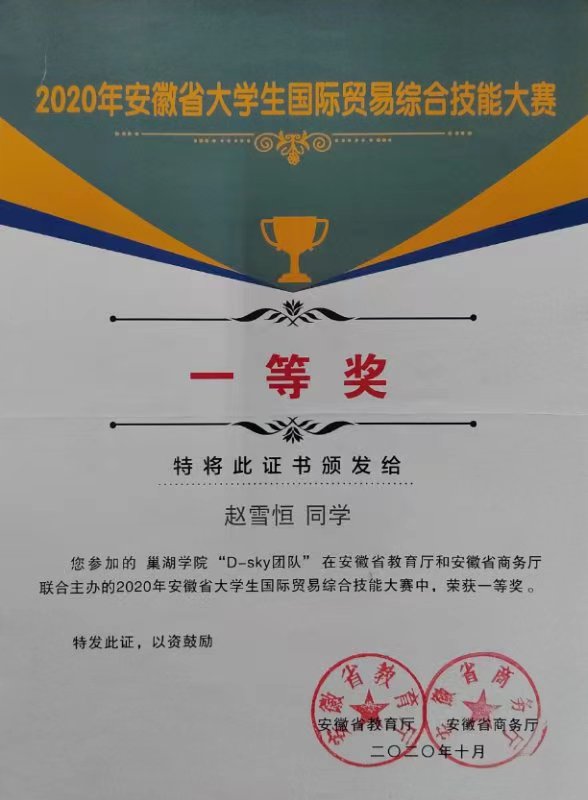 趙雪恒,男,漢族,1999年12月出生,中共黨員,巢湖學院經濟與法學學院2019級國際與貿易專業學生。在校期間,他曾多次參加校級以上的競賽項目,專業實踐經驗豐富,榮獲安徽省大學生國貿技能大賽一等獎、“優秀學生干部”“校十佳雙創之星”“校十佳大學生”等榮譽。