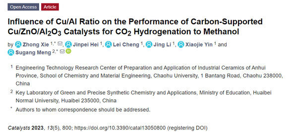近日,巢湖學院化材學院綠色能源化工科研團隊謝忠博士在高性能Cu/ZnO/Al2O3催化劑研究中取得進展,相關成果以“Influence of Cu/Al Ratio on the Performance of Carbon-Supported Cu/ZnO/Al2O3Catalysts for CO2Hydrogenation toMethanol”為題發表在國際權威期刊《Catalysts》(SIC收錄,IF:4.501)。
