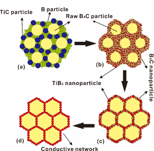B4C陶瓷具有熔點高、密度低、化學穩定性強、耐磨性好等優良性能,廣泛應用于對耐磨性要求高的領域,如裝甲防護。在B4C基體中引入第二相TiB2形成B4C?TiB2復相陶瓷,不僅能有效提高B4C陶瓷的力學性能,還能顯著降低復相陶瓷的電阻率,實現結構功能一體化。然而,TiB2相對于B4C比重大、本征硬度低,因此,TiB2的加入增加了復相陶瓷的比重,降低了材料的硬度。研究發現,降低B4C?TiB2復相陶瓷中TiB2一定的比例,在保證高致密度和良好導電性的前提下,可制備出超輕、超硬的B4C?TiB2復相陶瓷材料。通過研究復相陶瓷的微結構與其導電性能、力學性能間的關系,采用化學反應協同基體晶粒選擇性吸收生長法可制備一種低TiB2含量的超輕、超硬、導電性能好的B4C?TiB2復相陶瓷并實現對B4C?TiB2復相陶瓷的結構和功能可控調節。該研究方法為結構功能一體化材料的制備及性能研究提供了一種新的思路。
