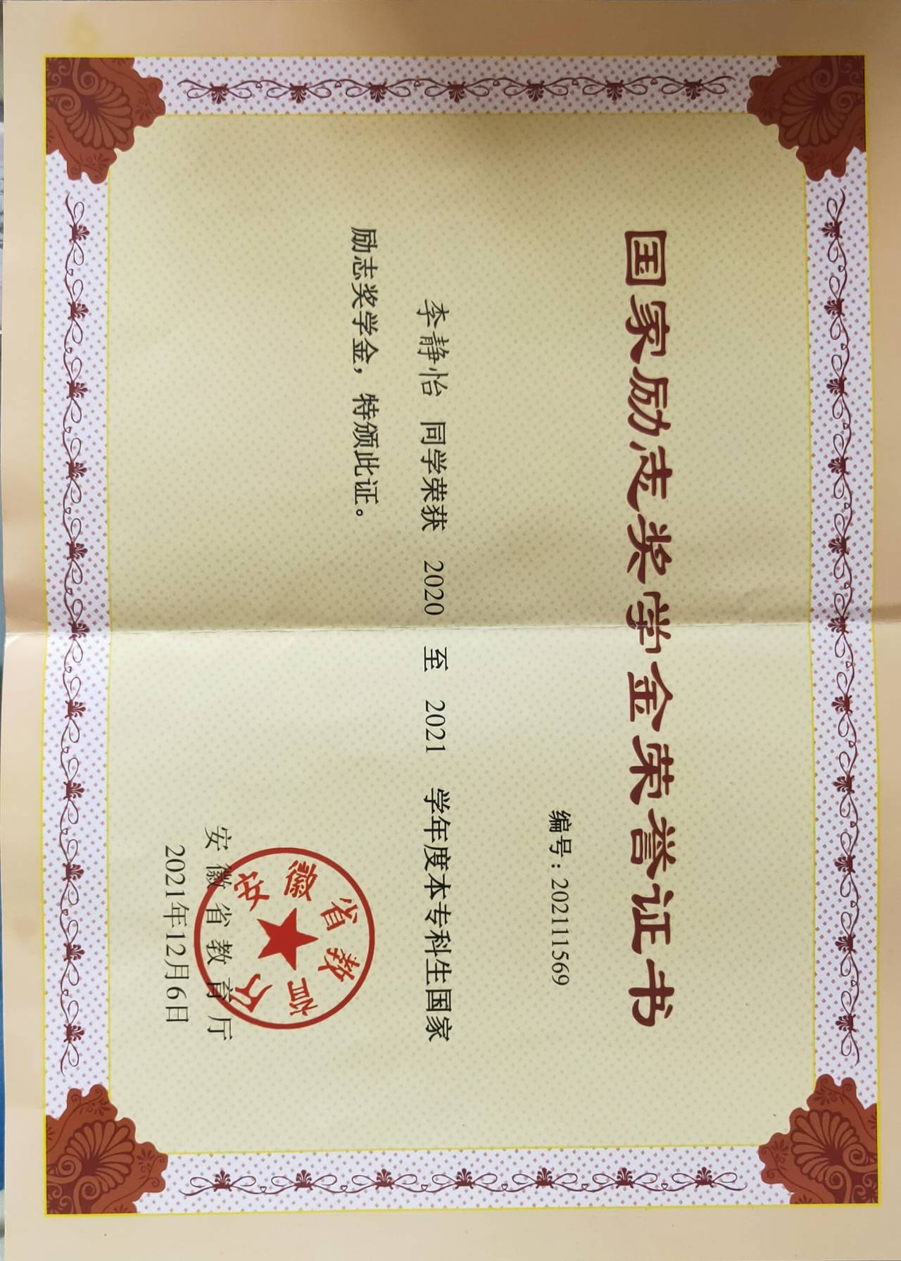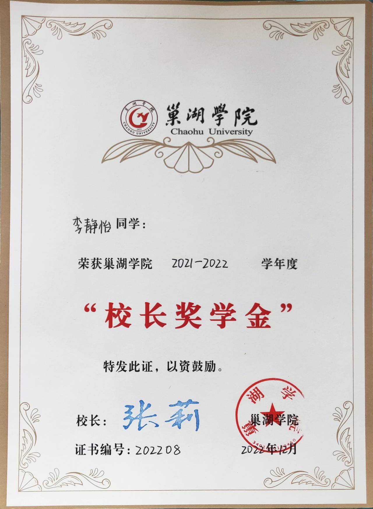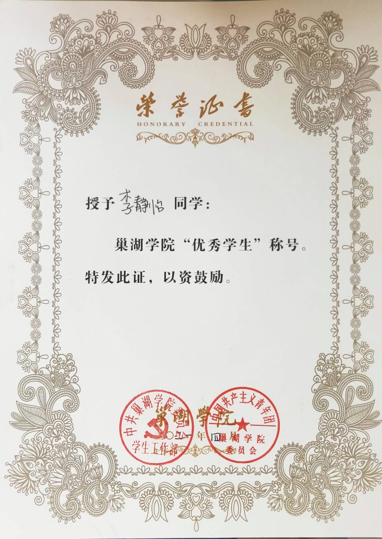 李靜怡,女,漢族,2001年1月12日生,中共黨員,安徽省亳州人,巢湖學(xué)院機(jī)械工程學(xué)院2019級(jí)機(jī)械電子工程專業(yè)學(xué)生。在校期間,勤奮學(xué)習(xí),虛心好學(xué),專業(yè)成績(jī)一直排名第一,曾獲國(guó)家勵(lì)志獎(jiǎng)學(xué)金、巢湖學(xué)院校長(zhǎng)獎(jiǎng)學(xué)金和校級(jí)一等獎(jiǎng)學(xué)金。此外,積極參加各類學(xué)科競(jìng)賽,獲得第七屆安徽省“互聯(lián)網(wǎng)+”大賽金獎(jiǎng),第十屆安徽省“挑戰(zhàn)杯”大賽銀獎(jiǎng),第八屆安徽省“互聯(lián)網(wǎng)+”大賽銀獎(jiǎng),第九屆安徽省“青苗杯”大賽銅獎(jiǎng),第二屆安徽省大學(xué)生交通科技大賽優(yōu)秀獎(jiǎng)。
