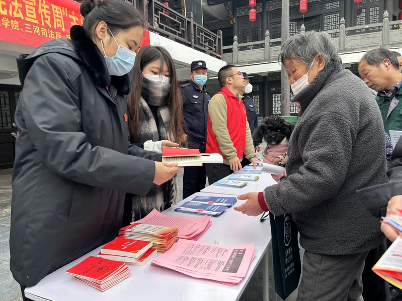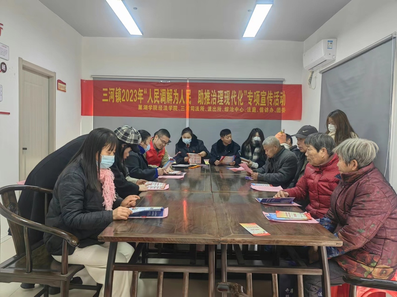 12月4日,巢湖學院一行赴肥西縣三河鎮聯合開展憲法宣傳教育活動,雙方共同為平安三河校地共建室揭牌并召開座談會。組織專業教師、學生黨員、學生干部前往三河鎮萬年臺景區、三河鎮中心學校和二龍家園(百姓評理說事點)等地進行憲法宣傳,向游客及群眾發放憲法宣傳品及相關法律法規宣傳折頁,現場解答群眾法律咨詢,面向學生開展專題講座,講述生活中的憲法。