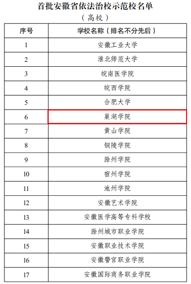 近日,安徽省教育廳印發《關于公布首批安徽省依法治校示范校名單的通知》,我校獲評首批全省依法治校示范校,全省共有17所高校入選,其中本科高校12所。