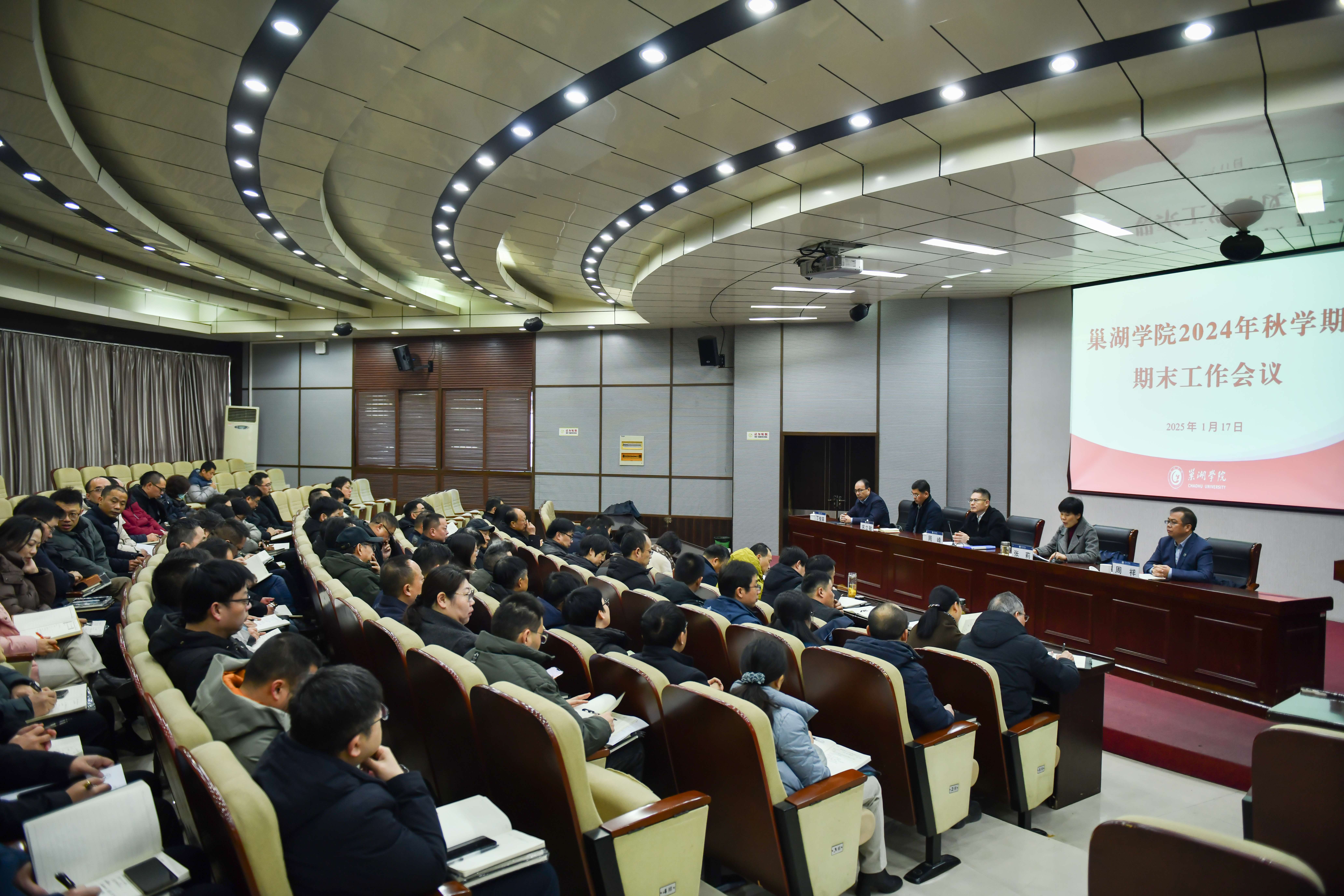 為全面總結2024年工作成效,部署安排寒假重點工作,1月17日上午,學校在致知樓報告廳召開2024年秋學期期末工作會議。校黨委書記周峰主持會議。校領導張莉、宋立敏、周祥、丁俊苗出席會議,處級領導干部參加會議。