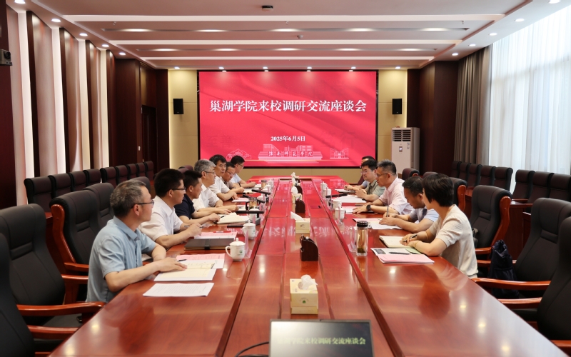 在淮南師范學院,周峰一行受到了黨委書記阮愛民和校長程剛的熱情接待。座談中,周峰對淮南師范學院第四次黨代會成功召開表示熱烈祝賀,并介紹了巢湖學院近年來在校園基本建設、學科專業調整以及人才隊伍建設等方面所做的工作。他表示,兩校有著良好的交往基礎,擁有深厚的情誼,均呈現良好發展態勢,希望兩校進一步加強交流、密切聯系,互相取長補短,進一步提升辦學水平,為早日實現申碩目標攜手共進。阮愛民表示,巢湖學院近年來各方面發展成績令人矚目,淮南師范學院積極搶抓機遇,以申碩工作為切入點,以高水平大學建設為目標,不斷深化改革,強化學科專業建設。希望雙方互促互進,共同推進應用型高水平大學建設。程剛簡要介紹了學校發展情況以及申碩和科研方面所采取的具體做法。他表示,兩校都面臨著申碩攻堅任務,希望雙方進一步加強交流與合作。