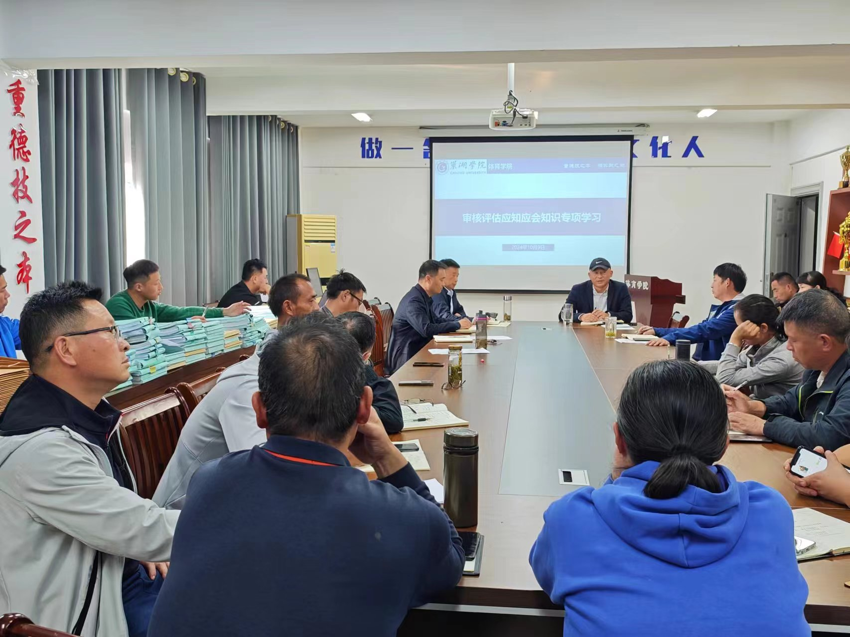 隨后,趙勝國帶領全體教師學習審核評估應知應會知識的專項內容,從“評估知識、校情校史、學校評估工作”三個方面系統介紹了本科教育教學審核評估應知應會知識,重點解讀了“一根本、兩突出、三強化、五個度、OBE理念、955質量保障體系”以及我校創新創業教育“一軸、兩翼、四驅動”體系等重點知識內容。同時結合相關專業和教學經驗,說明了訪談座談中的注意事項。