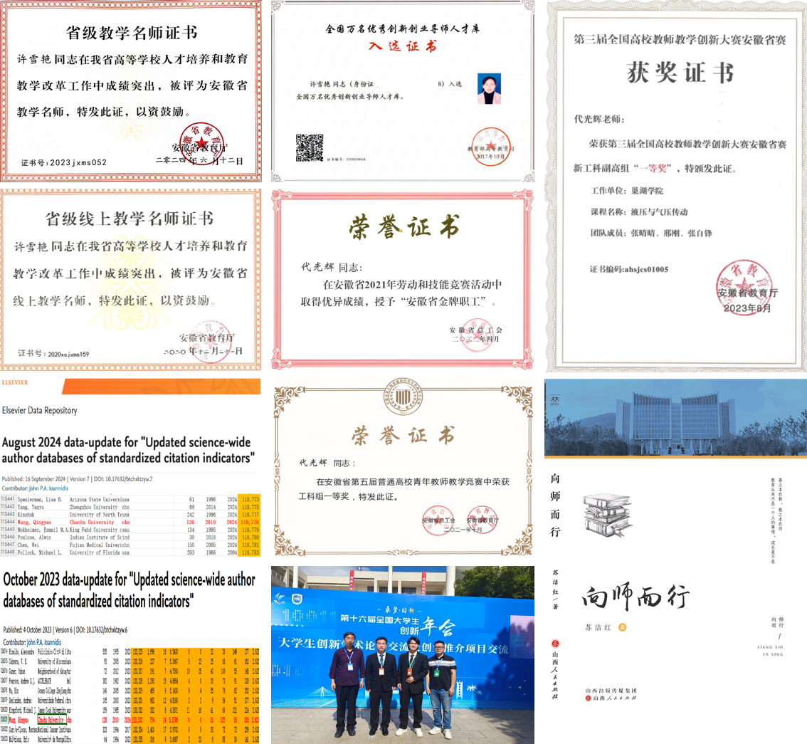 學(xué)院師德模范許雪艷教授,率先垂范、厲行改革,作為院長帶領(lǐng)學(xué)院踔厲奮發(fā)、勇毅前行,先后榮獲安徽省教壇新秀、安徽省師德先進(jìn)個(gè)人、全國萬名創(chuàng)新創(chuàng)業(yè)導(dǎo)師、安徽省教學(xué)名師等榮譽(yù)稱號(hào)。科研領(lǐng)軍王可勝教授,主持建設(shè)安徽省高效智能光伏組件工程研究中心,帶領(lǐng)團(tuán)隊(duì)服務(wù)光伏行業(yè)發(fā)展,以科技助力社會(huì)進(jìn)步,2022年因其卓越的科研成果榮獲中國循環(huán)經(jīng)濟(jì)協(xié)會(huì)科學(xué)技術(shù)二等獎(jiǎng)。科研達(dá)人王青堯教授,作為安徽省科研創(chuàng)新團(tuán)隊(duì)負(fù)責(zé)人,長期致力于光電應(yīng)用研究,主持多項(xiàng)國家自然科學(xué)基金及省部級(jí)項(xiàng)目,2023、2024連續(xù)兩年入選全球2%頂尖科學(xué)家榜單。教改先鋒代光輝副教授,創(chuàng)新教學(xué)理念,深耕課程改革,兩次獲得安徽省高校教師教學(xué)競賽一等獎(jiǎng),2022年因在勞動(dòng)和技能競賽中取得優(yōu)異成績,被安徽省總工會(huì)授予“安徽省金牌職工”稱號(hào)。向師而行蘇潔紅老師,作為學(xué)院團(tuán)委書記和輔導(dǎo)員,巧織育人網(wǎng)絡(luò),推行“適應(yīng)—基礎(chǔ)—規(guī)劃—決策”的育人路徑,鋪就學(xué)生成長成才之路,2023獲得安徽省輔導(dǎo)員年度人物提名。情懷教師邢剛,深耕實(shí)踐教學(xué),心系學(xué)生成長,在學(xué)生學(xué)科競賽中傾囊相授,精心輔導(dǎo),累積指導(dǎo)學(xué)生300余人,獲得省級(jí)以上學(xué)科競賽獎(jiǎng)項(xiàng)近60項(xiàng)。