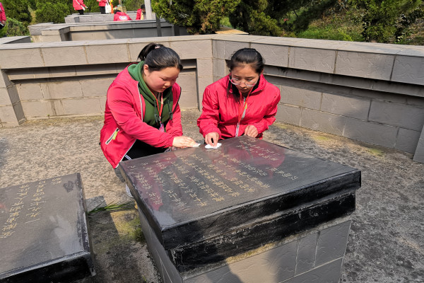 活動伊始,由志愿者代表胡勝玲帶領大家宣讀悼念詞,懷著沉重的心情志愿者們在紀念碑下默哀三分鐘。隨后,在莊嚴的國歌中,志愿者們深切感受到為實現(xiàn)民族復興所需承擔的責任與重擔。“青山有幸埋忠骨”,志愿者們向革命烈士紀念碑敬獻花,向曾保家衛(wèi)國的革命先烈鞠躬默哀,同時用準備好的紙巾細心地將墓碑上的灰塵擦拭干凈。碑文上,英烈的光榮事跡令每一志愿者倍感敬畏。掃墓結(jié)束后,志愿者們在陵園門口合影留念。至此,本次清明祭掃活動順利結(jié)束。