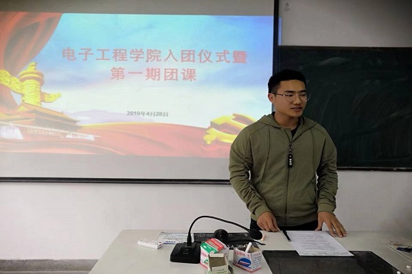 為規范發展團員工作,加強團員意識教育,4月28日中午,電子工程學院于博學樓205教室舉行新發展團員入團儀式暨第一期團課。此次活動由團總支組織委員李炘主持,團總支書記涂靜出席,全體新發展團員參與。