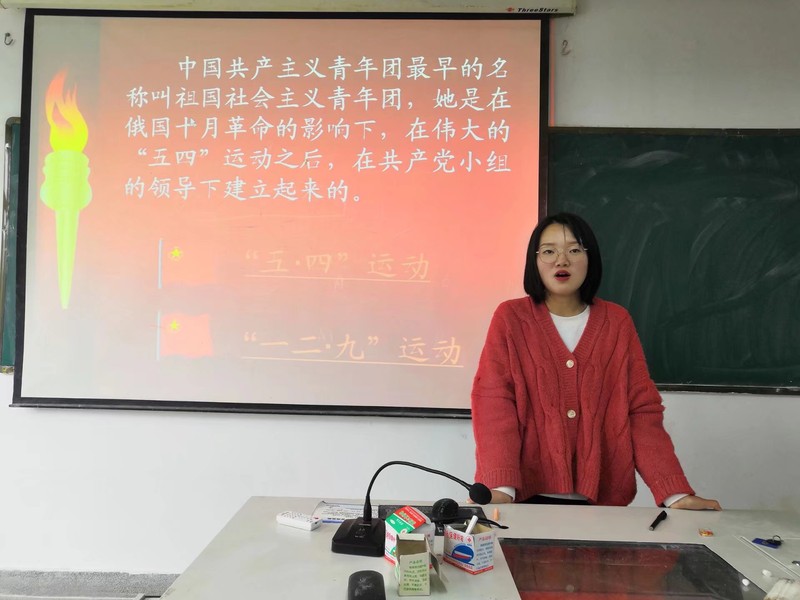活動伊始,李炘組織全體人員奏唱國歌并宣讀新團員名單,對他們表示熱烈的祝賀。緊接著,在李炘的帶領下,新團員們在火紅的團旗下進行宣誓,全體同學面向團旗立正,右手握拳,莊嚴宣誓,字字體現出他們為共產主義事業而奮斗的堅定決心。而后,入團介紹人代表高倩宣讀《團章》中有關團員的義務和權利的條款,新團員代表單傳斌講述自己對共青團的認識和感受,老團員代表徐劍鋒講述自己加入共青團的體會和成長經歷,并對新發展團員提出了建議。接著,李炘組織新團員奏唱團歌。在歡快激昂地奏唱之后,由涂靜帶領新團員進行第一期團課學習,主要從共青團的性質、任務、起源、背景以及五四運動等方面為新團員講解,更加增強了新團員對團組織的歸屬感。至此,此次活動在熱烈的掌聲中順利結束。