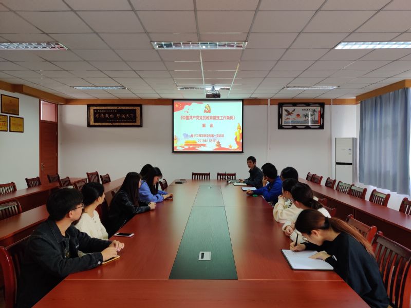 為貫徹落實“不忘初心、牢記使命”主題教育學習活動深入開展,進一步加強基層黨支部標準化建設,切實增強基層黨組織的戰斗堡壘作用,11月6日中午,電子工程學院學生第一黨支部書記汪軍在篤行樓會議室為支部黨員和積極分子上了《中國共產黨黨員教育管理工作條例》(以下簡稱《條例》)解讀的專題的黨課,切實使廣大黨員學生把學習、踐行《條例》精神落實到實處,增強黨員學生學習、領悟、落實黨章、黨規的覺悟。