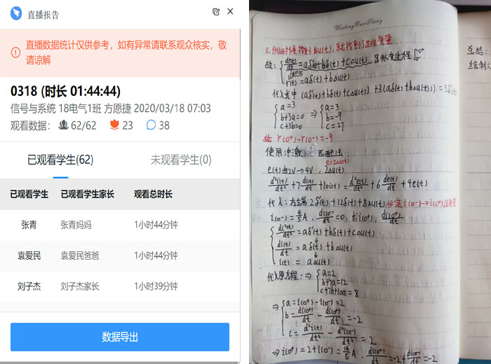 方老師科學開展監督環節,課程中建立了每日筆記提交批閱的制度,并讓同學認知到筆記是課本的替代,是疫情背景下有效復習的方法,2個教學班的筆記提交率均為100%;并且利用“釘釘”學習時長報表的功能,有針對的“點對點”提醒同學學習時長的保證。