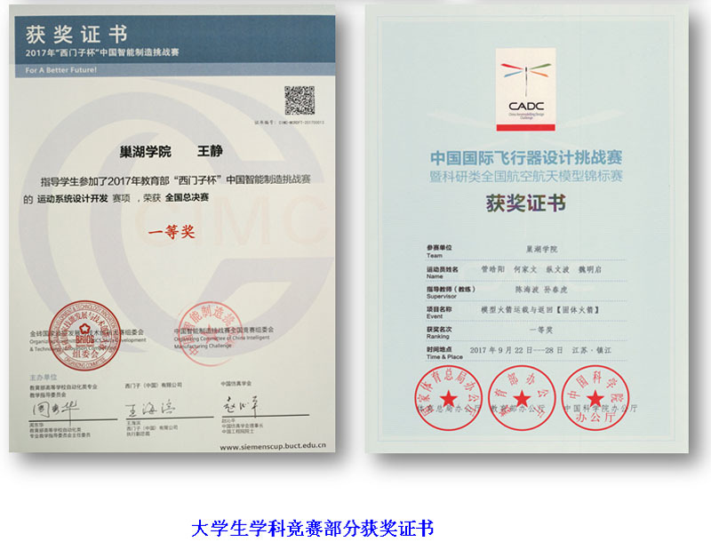 近年來,學院組織學生參加“西門子杯”全國大學生中國智能制造挑戰(zhàn)賽、中國國際飛行器設計挑戰(zhàn)賽、全國大學生智能汽車競賽、全國大學生電子設計競賽、全國應用型人才技能大賽、安徽省百所高校百萬大學生科普創(chuàng)意創(chuàng)新大賽、安徽省“互聯(lián)網(wǎng)+”大學生創(chuàng)新創(chuàng)業(yè)大賽、“挑戰(zhàn)杯”安徽省大學生課外學術(shù)科技作品競賽、安徽省高校物聯(lián)網(wǎng)應用創(chuàng)新大賽、安徽省大學生職業(yè)規(guī)劃設計大賽等各類學科與技能競賽,獲省級以上獎勵近300項。