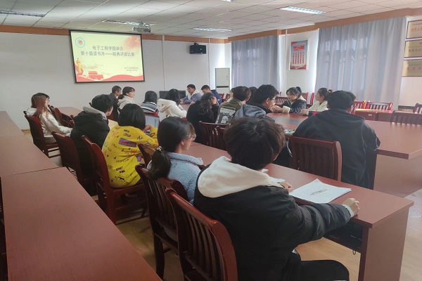 為了幫助當代大學生了解紅色文化,學習紅色思想,加強個人的愛國情懷,11月24日下午,電子工程學院團總支于篤行樓二樓會議室舉辦“第十屆讀書月——經典評讀”比賽。此次比賽由電子工程學院團總支宣傳部部長楊俊磊主持,團總支副書記孫一帆,輔導員汪軍、卓瀟擔任評委,21級各班級參賽選手參加。