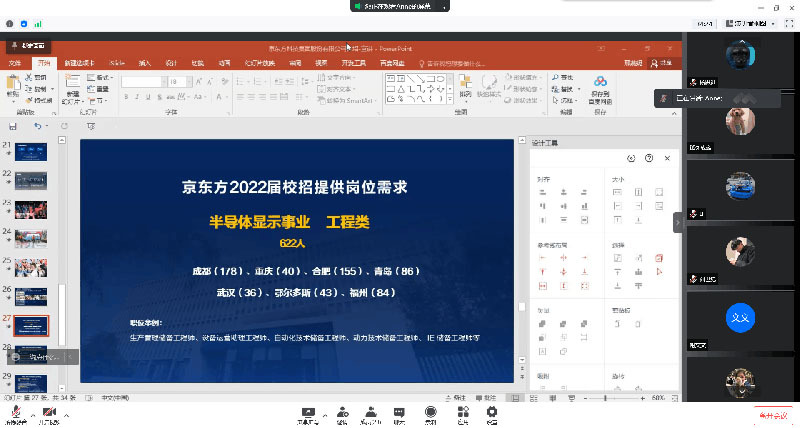 為做好常態化疫情防控期間畢業生就業工作,搭建畢業生與用人單位的交流平臺。4月18日下午,京東方科技集團股份有限公司攜手電子工程學院共同舉辦春季校園線上招聘宣講會,本次宣講會由京東方科技集團股份有限公司招聘經理燕妮、趙安主持,電子工程學院2022屆畢業生參會。