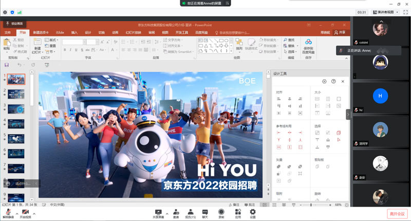 會議伊始,燕妮放映了京東方科技集團股份有限公司視頻宣傳片。隨后,燕妮以ppt的形式就集團的一些規章制度、福利待遇、企業文化、現有產業結構、組織構架、人力資源政策等幾個方面向同學們做了簡單介紹。