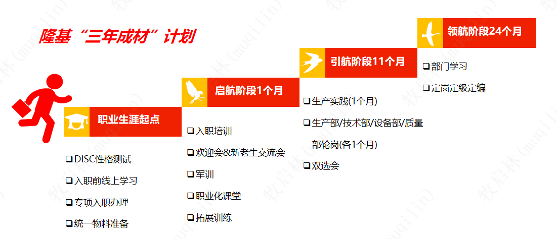 公司人力資源部下設組織人才發展組,專項推進人才發展項目工作,針對應屆畢業生設立隆基“三年成材”計劃、育隆計劃、潛隆計劃等人才培養規劃項目,突破常規培訓模式,保障每位員工獲得充足的學習成長機會。