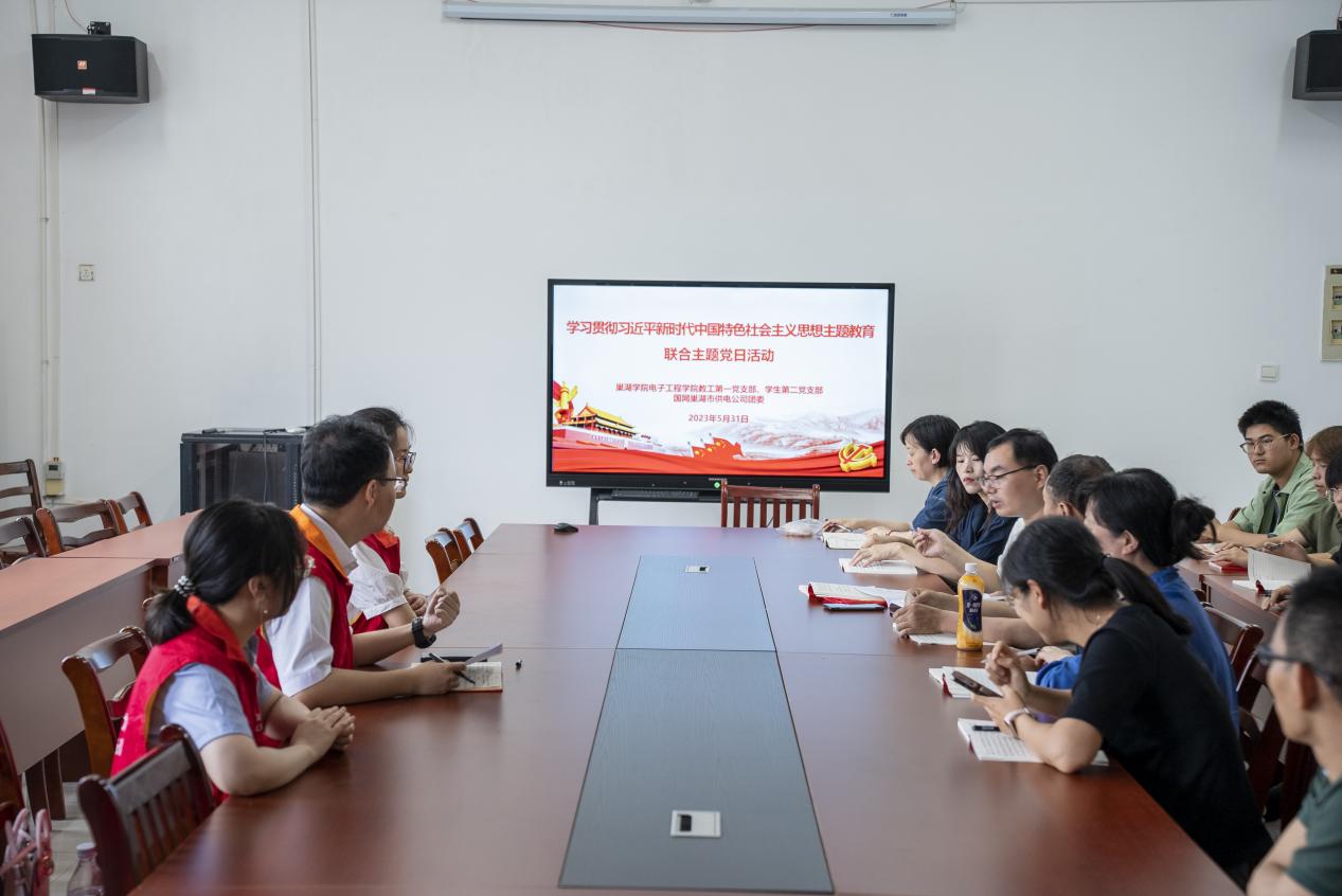 在全校上下認真開展學習貫徹習近平新時代中國特色社會主義思想主題教育的熱潮中,為了將“學思用貫通,知信行統一”,同時提高學生的專業認知,幫助學生進一步了解專業的就業方向,制定大學期間的學習規劃以及未來的職業規劃。2023年5月31日下午,電子工程學院教工第一黨支部、學生第二黨支部、國網巢湖市供電公司團委開展“學習貫徹習近平新時代中國特色社會主義思想主題教育”聯合主題黨日活動。黨支部全體黨員以及巢湖供電公司青年黨員代表、部分團干部參加會議,會議由教工第一黨支部書記王靜主持。