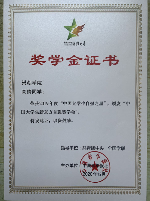 18電氣2班高倩同學榮獲2019年中國大學生自強之星