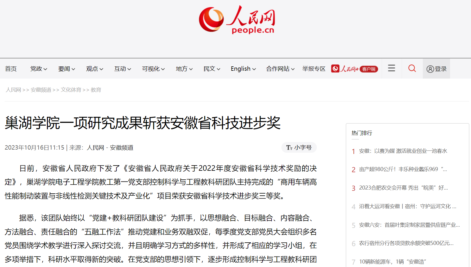 2023年10月16日,人民網在教育板塊,報道了《巢湖學院一項研究成果斬獲安徽省科技進步獎》。在學校和學院黨委領導下,逐步形成控制科學與工程團隊,主持完成多項教科研和育人成果。